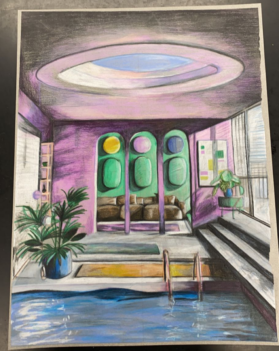 This piece was an assigned project for a college portfolio done in Prismacolor pencils. I used architecture from the 1960s & 70s as a reference for this drawing. Prints & posters of this piece are available for purchase.